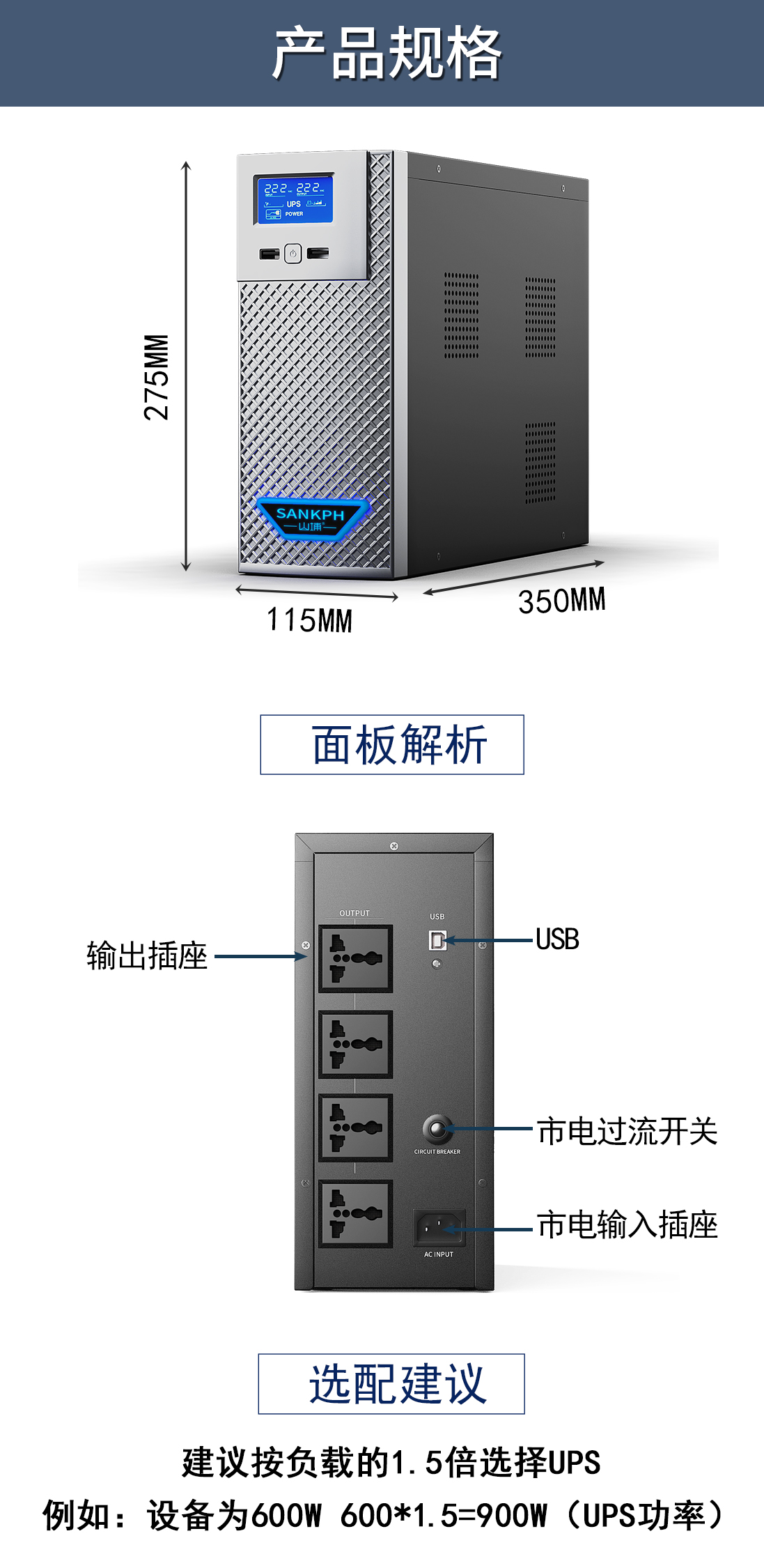 【品 牌】山埔 【型 號】SP1500 【功 率】1500VA/900W