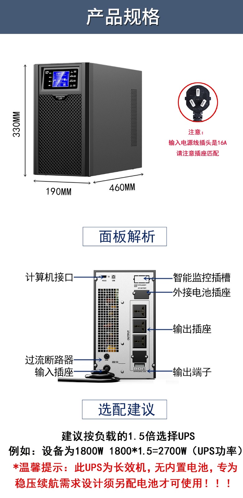【功 率】3000VA/2700W 主機尺寸:450*192*330mm