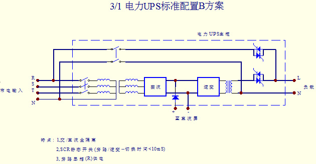 5、特殊的靜態開關設計,具備真正的零中斷運作,因為輸出具有隔離變壓器,可以實現電流隔離,在此基礎上設計的靜態開關電路,保證任何狀態轉換下,輸出電壓均無中斷時間,是真正意義的零中斷,保護了用戶負載正常安全的工作。